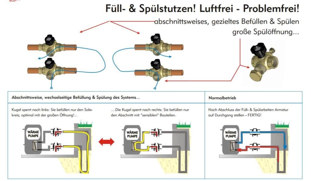 Mit einem KFE-Hahn eine 35er Leitung zu spülen kostet Zeit und Effizienz. Darum: Füll-& Spülstutzen mit Spülöffnungen in Dimension der eingebundenen Leitung!